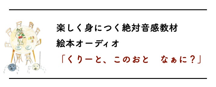 メインブック(主教材)『くりーと、このおと なぁに?』主人公の黒猫くりーとが仲間達と繰り広げる少し不思議な物語。絵本に合わせたナレーションと音楽入りのオーディオがついています。スペイン人画家ホワン・マシアスによって描かれた素敵な絵本と共に聴いて、絶対音感の基礎を養って行きます。