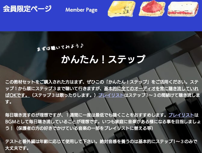 有料会員に登録する事ができます。(メールにて登録方法をお送りします。記された期間内にご登録をお願いします。)会員限定ページにアクセスできる様になり、かんたんステップを使用して教材をより使いやすく使う事ができるページになっています。また、上記通りプレイリストがこのページ内にもあります。