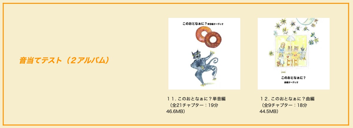 1. メイン教材オーディオ「くりーと このおと なぁに?」 (全27チャプター:52分 128.1MB)