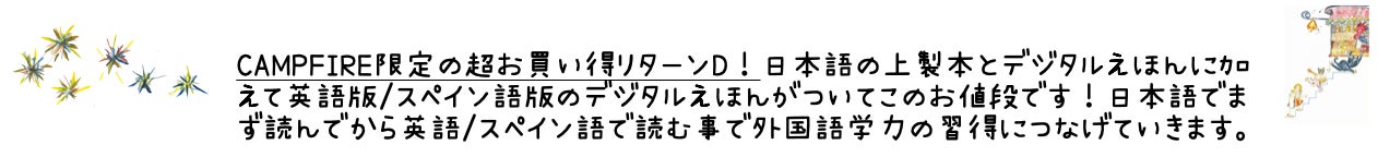 リターンには上製本えほん以外に、デジタルえほんもご用意しました。また、日本語版プラス、デジタルえほん英語版3冊セット又はスペイン語版のどちらかが選択できるリターンも、今回はCAMPFIRE特別限定リターンとして特別にご用意しました。(現在一般販売の予定はありませんので、お見逃しなく!)日本語で聴いた後に英語で聴いたりする事でお子さんの英語習得に一役買ってくれると思います!また、スペイン語版もご用意しましたので、もしスペイン語版の方に興味がある方はスペイン語版をどうぞ。それぞれネイティブの女性のナレーターが物語を楽しくナレーションしてくれています。躍動感のあるナレーションをぜひ楽しんで頂けたらと思います。