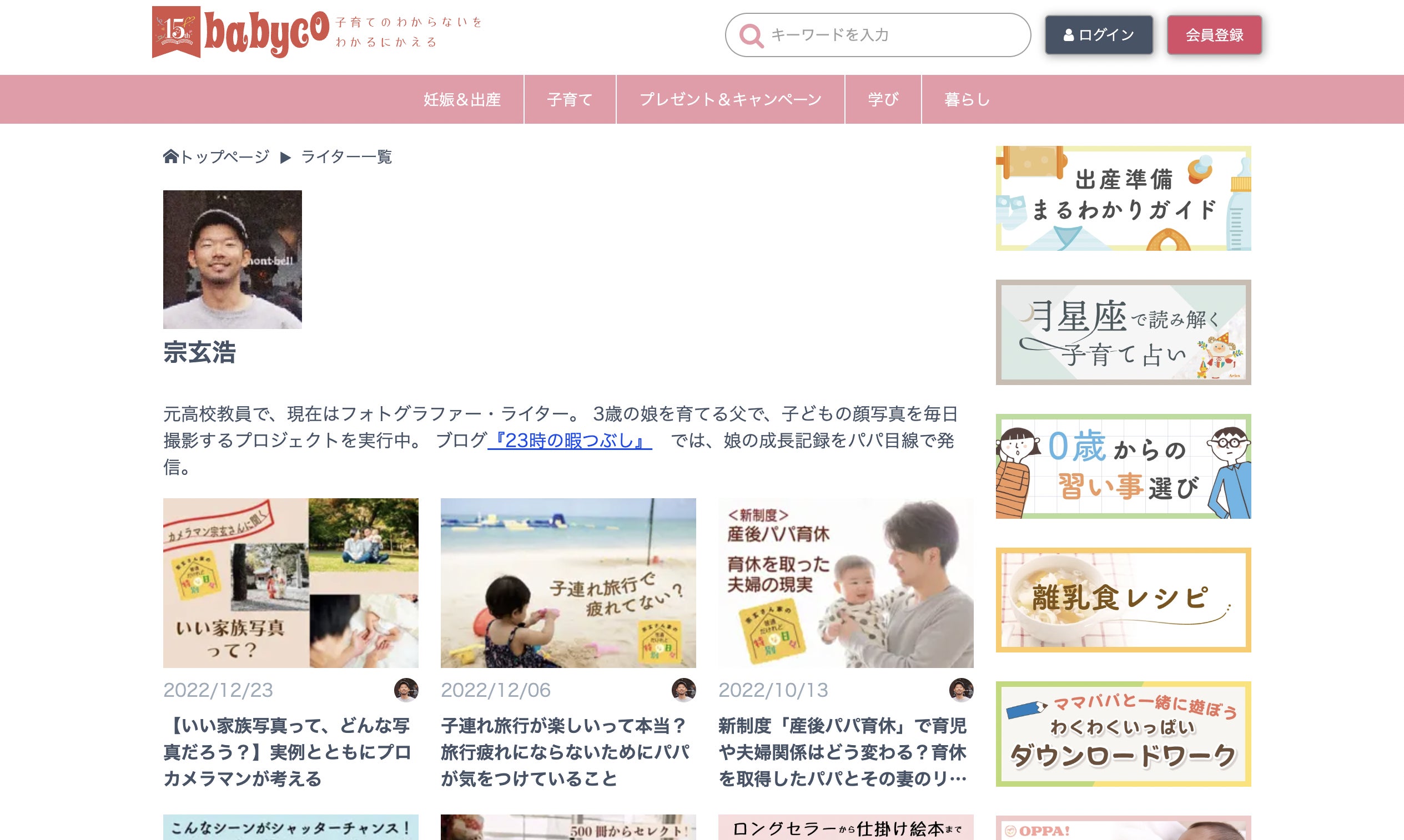 また、ライターとしては子育て応援サイトbabycoで育児コラム「宗玄さん家の普通だけど特別な日常」を連載するなどの活動をしています。