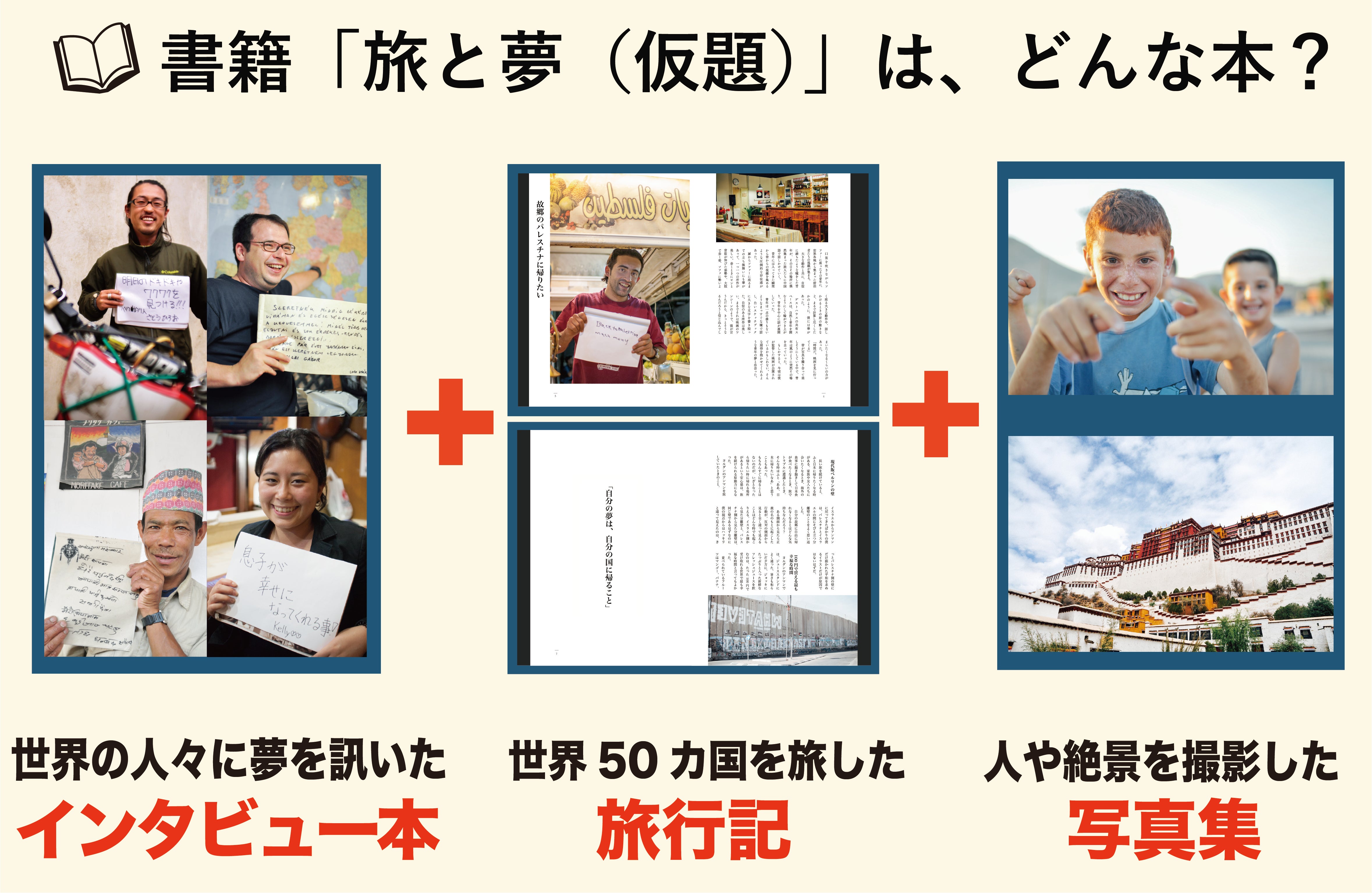 「旅と夢をテーマとした本の出版&写真展の開催&本の寄贈」をする中で、『子どもから大人まで広い視点で夢を考えて語れるキッカケをつくる』ことを目標にクラウドファンディングをさせて頂きます。