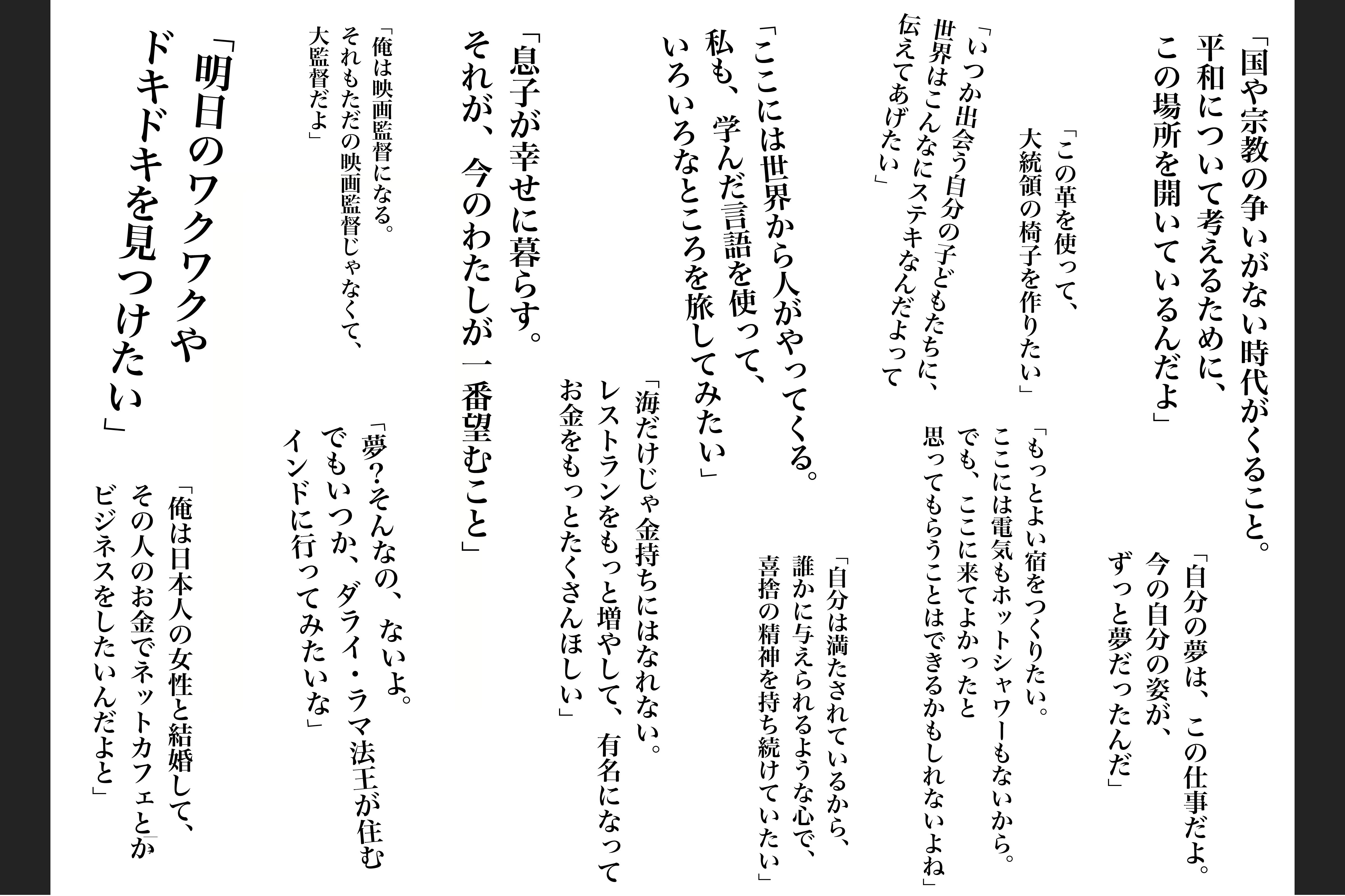 では、日本の文化や教育や環境とは異なる世界を生きてきた人々は、どんな夢をもっているのだろうという疑問が、この本が生まれたキッカケです。