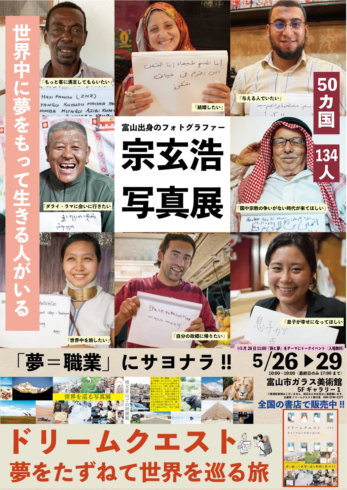 2023/05/28 13:30宗玄浩写真展『ドリームクエスト 夢をたずねて世界を巡る旅』が富山市ガラス美術館で開催されています。【個人スポンサー】書籍と写真展にお名前を掲載+サイン入り書籍1冊 を支援してくださった方のお名前を、展示会場入口に掲載させて頂きました。写真展については無事に開催することができました。また、富山県高岡市の小中特別支援学校や図書館に本を寄贈しましたので、改めて紹介させてもらいます。 もっと見る