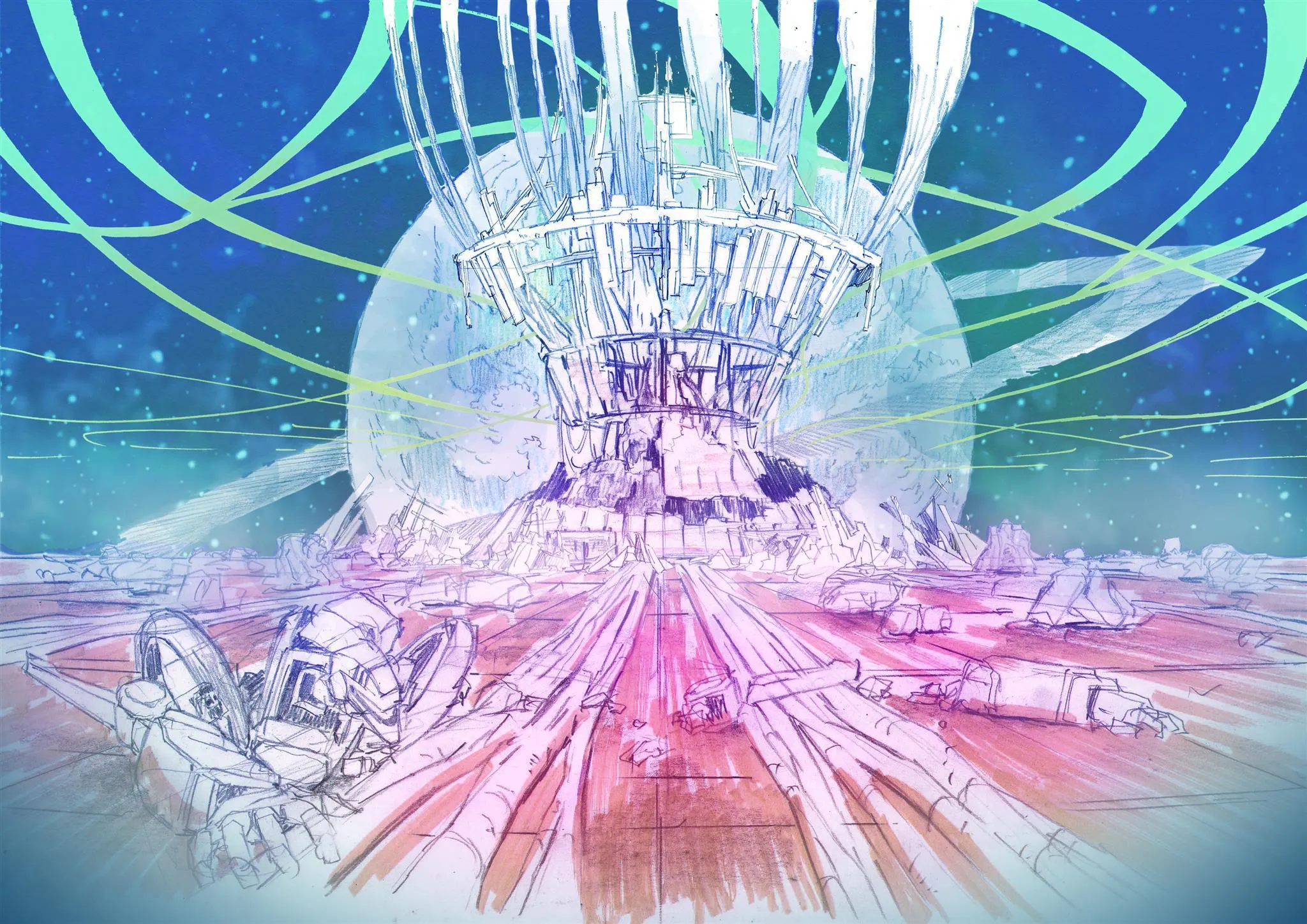 すごく壮大な世界…!? たくさん出てる管とか緑の光は一体なんなんだろう?( ゚O゚