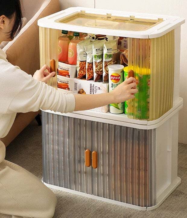 スライド式扉で出し入れ楽々!工具不要で積み重ねて使用できる両開き収納ボックス