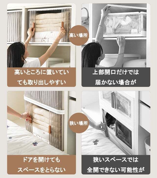 前方の開口だけでは、毎回中身を確認しながら取り出す必要があって面倒ですね。前開きのドラと上フタの両方からモノを取り出せる2WAYタイプなら手間が省けます。