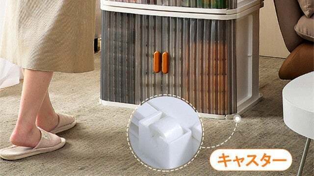狭いスペースでもドアを全開にできるスライド式ドア!大きく開口できてモノが取り出しやすい。折り畳み式の収納ボックス、使えない時には折りたたんで隙間に収納、スペースを取らない。ラクラク移動できるキャスター付きの便利タイプ。平らな場所でスムーズに移動可能!
