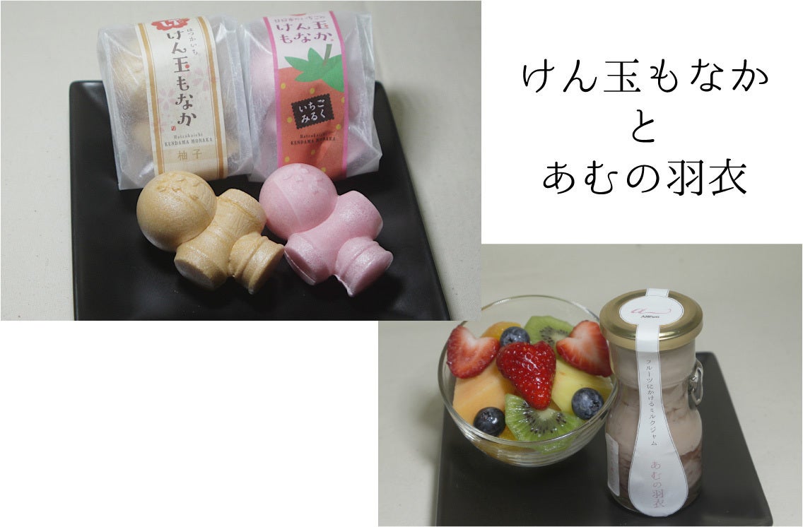 そしてけん玉商店街の老舗和洋菓子店ながおの『けん玉もなか』いちごミルク餡と柚子餡の組み合わせ。このもなかの餡にはAMFarmで加工を請け負った、いちごジャムと柚子ジャムを使っています。