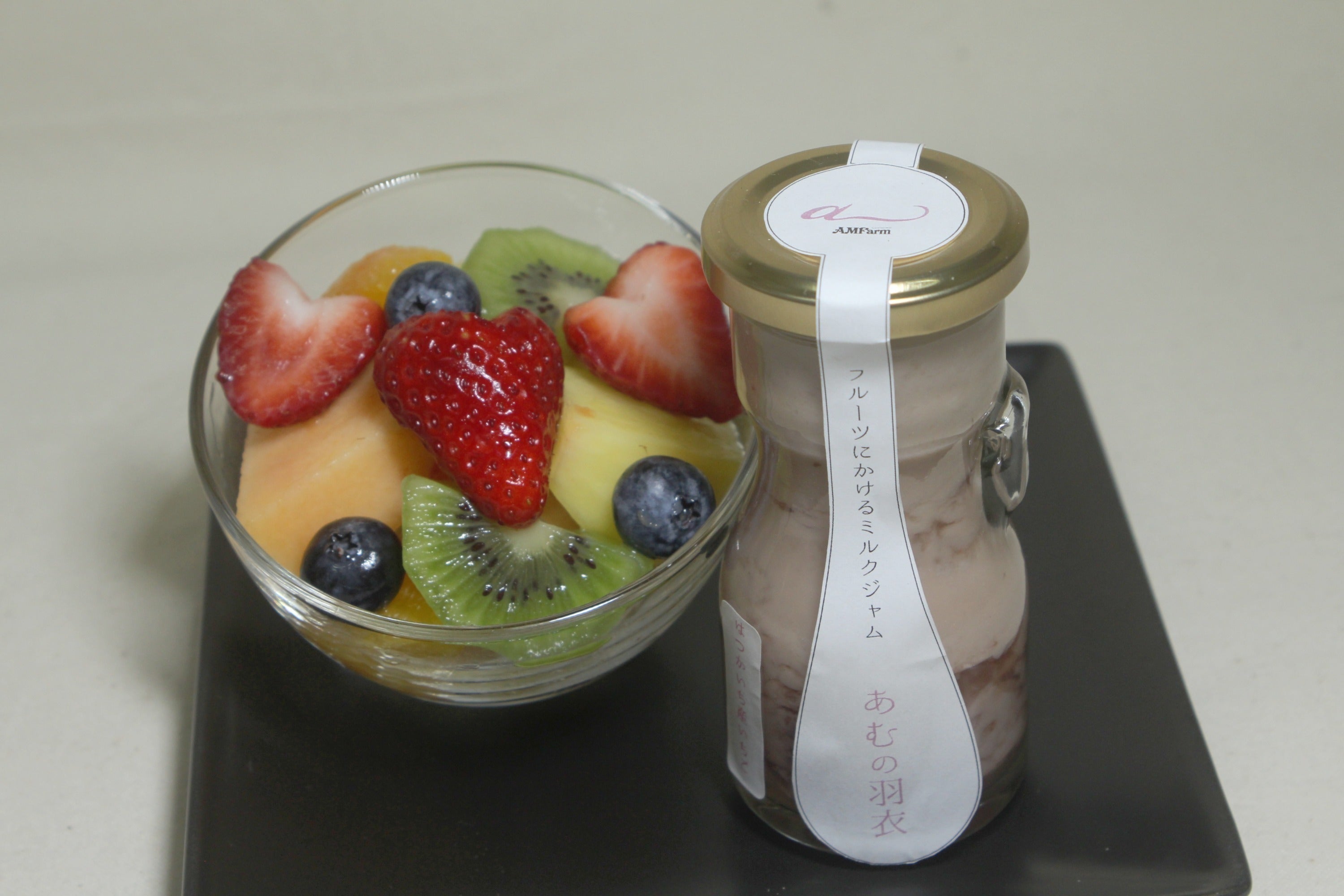 今回、商品をブラッシュアップするセミナーぶち塾を通してそのニーズに応える時が来ました。地元の大学生たちと一緒に考え商品化できたのがこちらのフルーツにかける新感覚のミルクジャム「あむの羽衣」です。