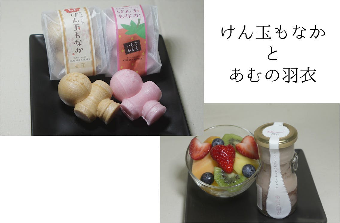 5000円のリターン+AMFarmのおすすめジャム1本+けん玉商店街の老舗和洋菓子店 注1)和洋菓子ながおの『はつかいちけん玉もなか』3個