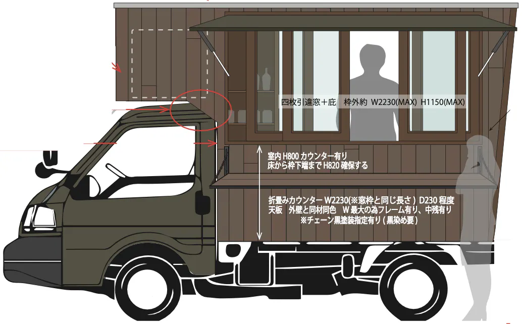 本体車両を軽トラにして全体を小さくし、ウッドショックで木が高くなっているので素材を変えれば、500万円でキッチンカーを作ることは可能です。