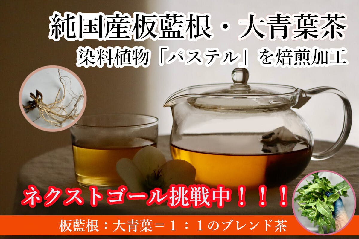 追加したリターン2つ目は、純国産板藍根・大青葉使用「パステル茶」1袋と、幻の染料パステルで染めたストール1枚のセット 39,000円 (5セット限定)。