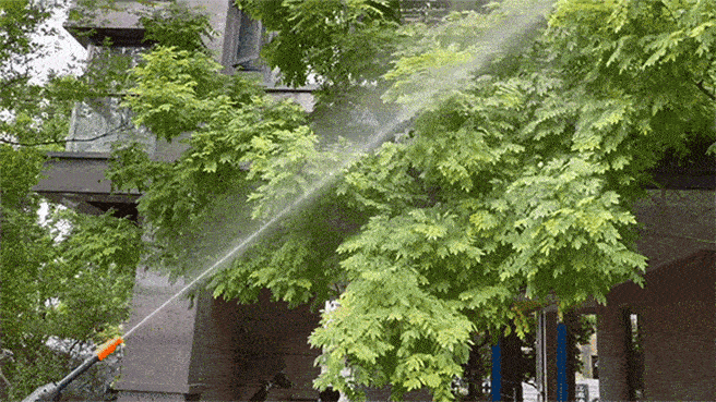 2.ホースを給水口に差し込み、水漏れを防ぐためにパチッと嵌め込み、多機能ノズルを先端に接続します。
