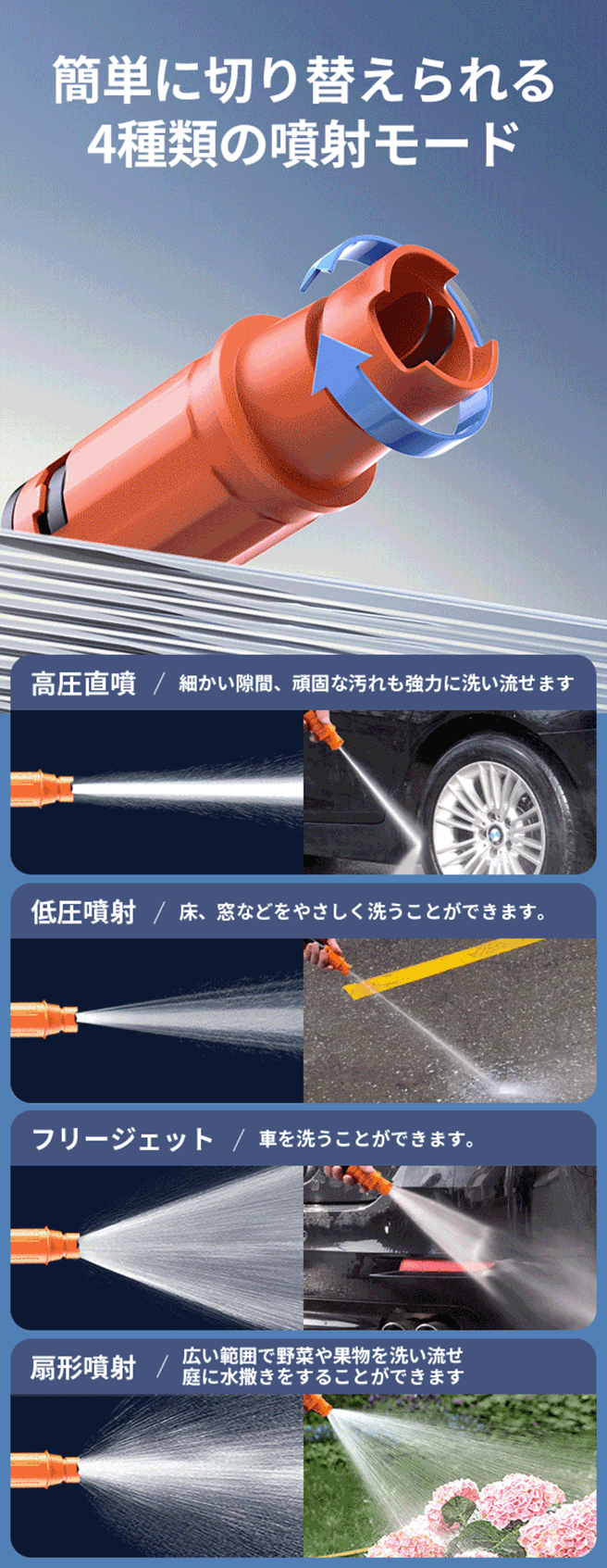 - 4種類の噴射モード搭載、細かい部分から広い範囲まで洗浄可能。