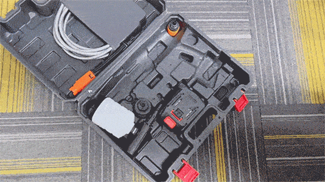 充電式高圧洗浄機「CHITAI」は自動吸水方式で、水道の接続が不要です。 バケツに水を入れてホースを差し込めば、どこでも水を汲んで高圧で流すことができます。
