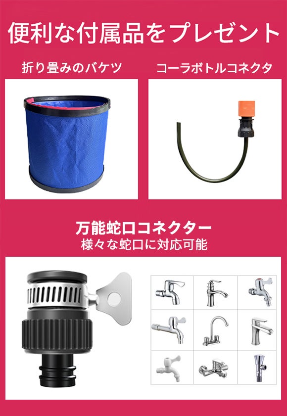 - 折り畳みバケツなどが付属して便利さアップ。