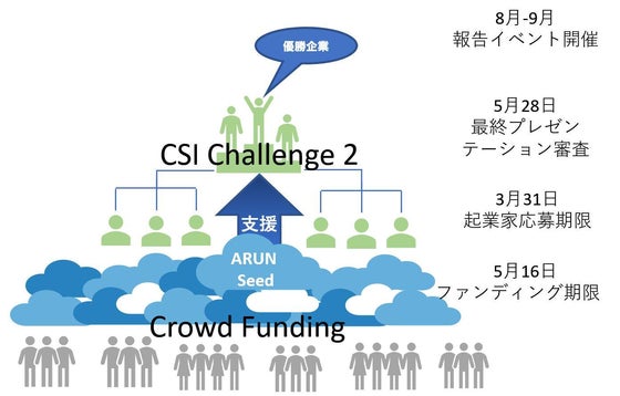 ここで、現在進行しているCSI(=Cloud Social Investment)のスケジュールを簡単にご紹介します。画像にある ビジネス・コンペティションであるCSI Challenge 2とクラウド・ファンディングが進んでします。CSI Challenge 2の締切は、3月31日です。そこから起業家が推し進めている事業の審査が開始され、5月28日に、ファイナリストによるプレゼンテーションと最終審査が実施されます。その審査前の、5月16日がクラウド・ファンディングの締切日となります。