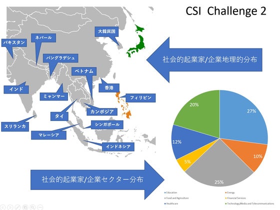CSI Challenge 2への応募社会的起業家数が、締切時点で128団体を超えたとお伝えしました。彼らの地理的分布とセクター分布を把握してみました。セクター分布においては、応募者は複数選択可であり、ここにある分類では「その他」は割合計算の対象となっていませんので、ご了承下さい。Education、Food and Agriculture、Technology,Media and Telecommunications分野が20%以上であるのが分かります。