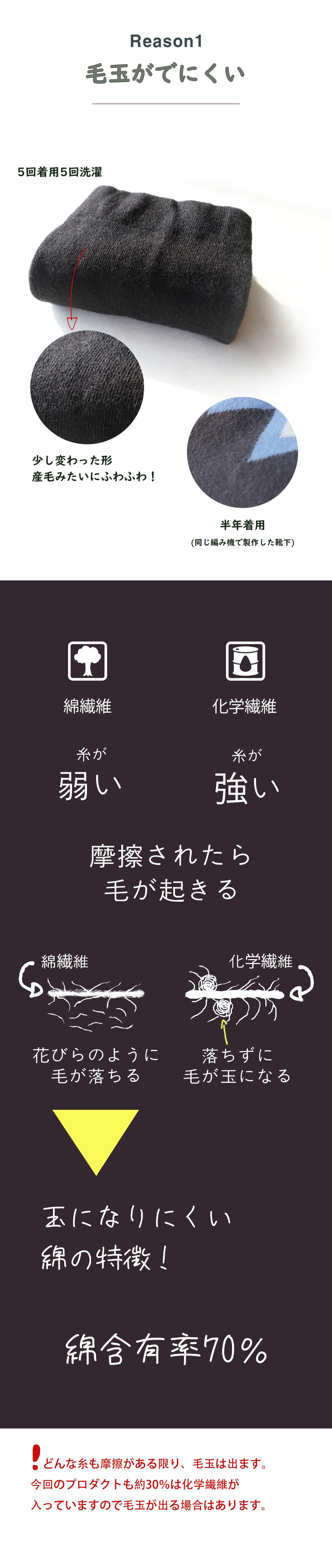 だた、綿靴下の場合毛玉の模様が科学繊維で製造されたものとはちょっと違います。玉の形ではなく、以下の写真のようにふわふわとした産毛みたいなものが生じます。これが天然綿の特徴です。毛玉が全く出てこないとは言えませんが、科学繊維靴下よりは毛玉の発生は少ないです。