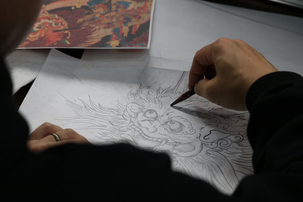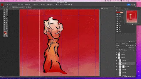赤を基調に全てを喰らうような恐ろしい顔、掴み所のない体、複数のブラシと多色で表現した艶と色っぽさ、筋肉隆々の鬼の腕が特徴。