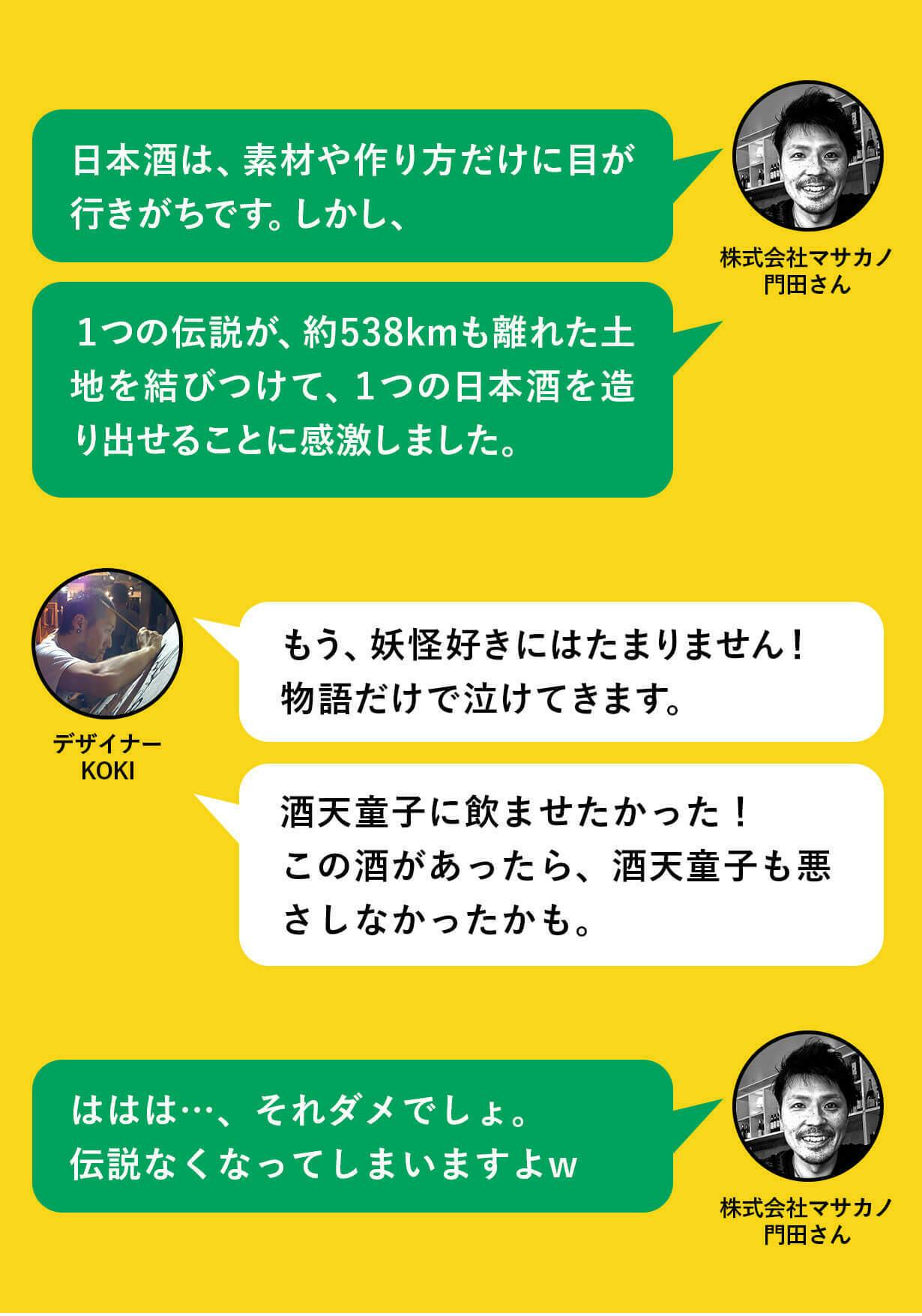メッセージを最後まで読んでいただきありがとうございます。今回の「酒呑童子のパッケージ」は、こだわりの商品を知ってほしい! 地方技術を知ってほしい! 酒呑童子や妖怪、日本の伝説を楽しんでほしい! この思いを全国に巡らせたいと企画しました。ぜひ、手にとって頂いて伝説を日本酒の両方を味わってください。