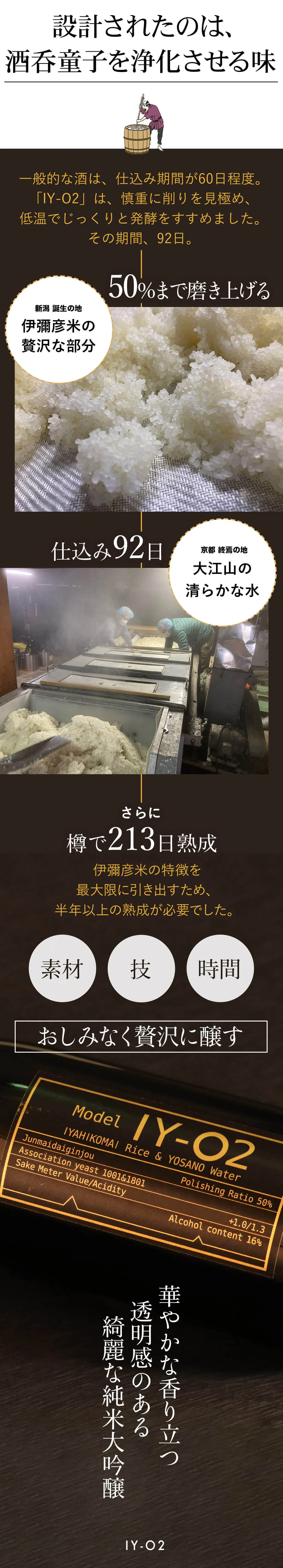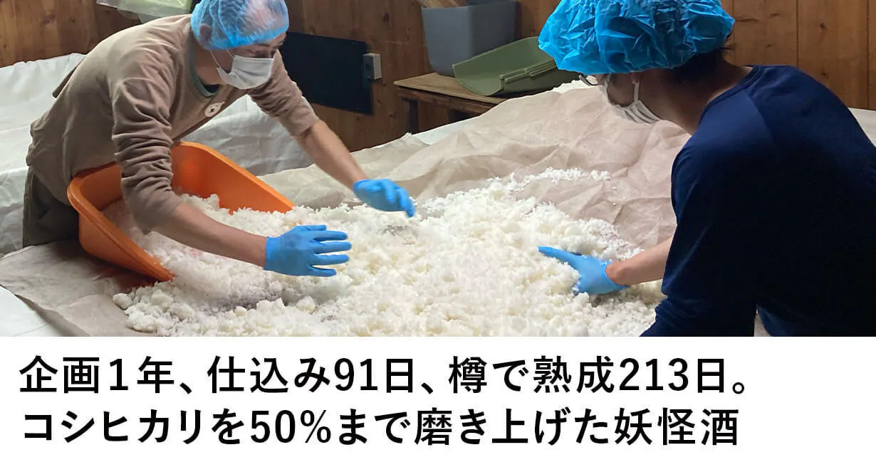 妖怪酒と呼びたくなる物語と困難なコシヒカリをあえて、難しい方法で醸してできたのが「IY-O2」。米、酒を贅沢に作り上げてきた熱い作り手たちの思いが日本酒になっています。