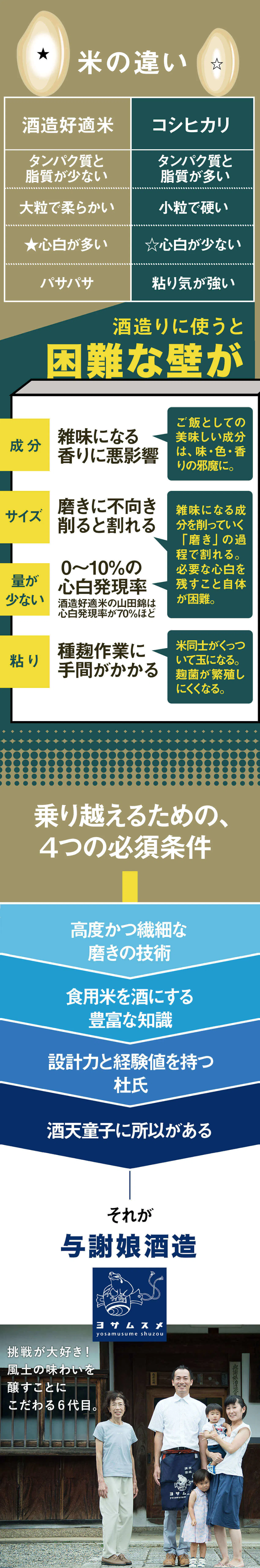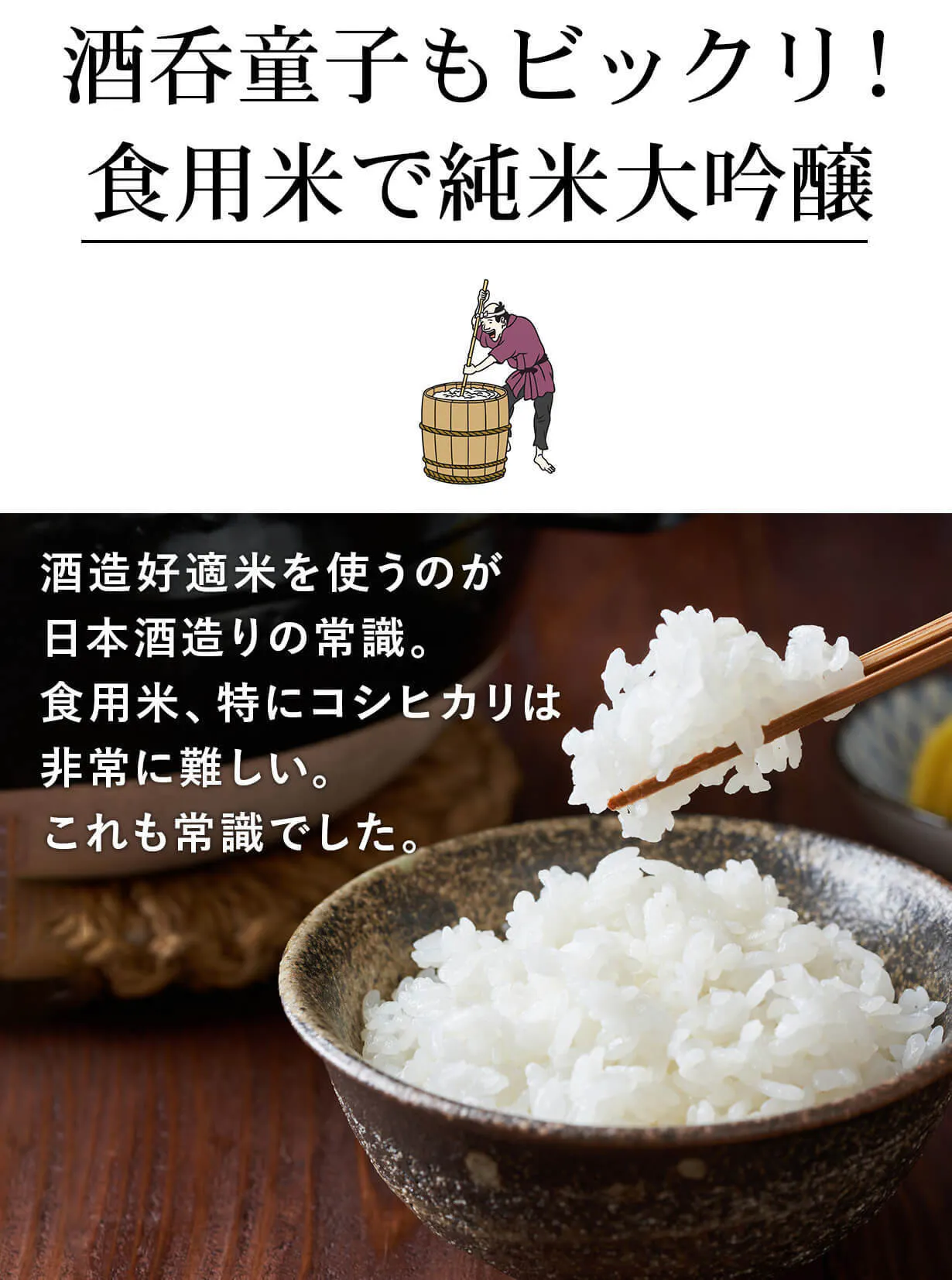 食用米は、日本酒造りの工程に支障をきたすデメリットを持っているため、「美味しい酒」を作り出すことが非常に困難と言われてきました。