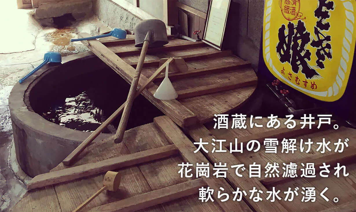 酒の仕込み水は、酒呑童子が住んでいたと言われる大江山から豊富に湧く伏流水を使っています。