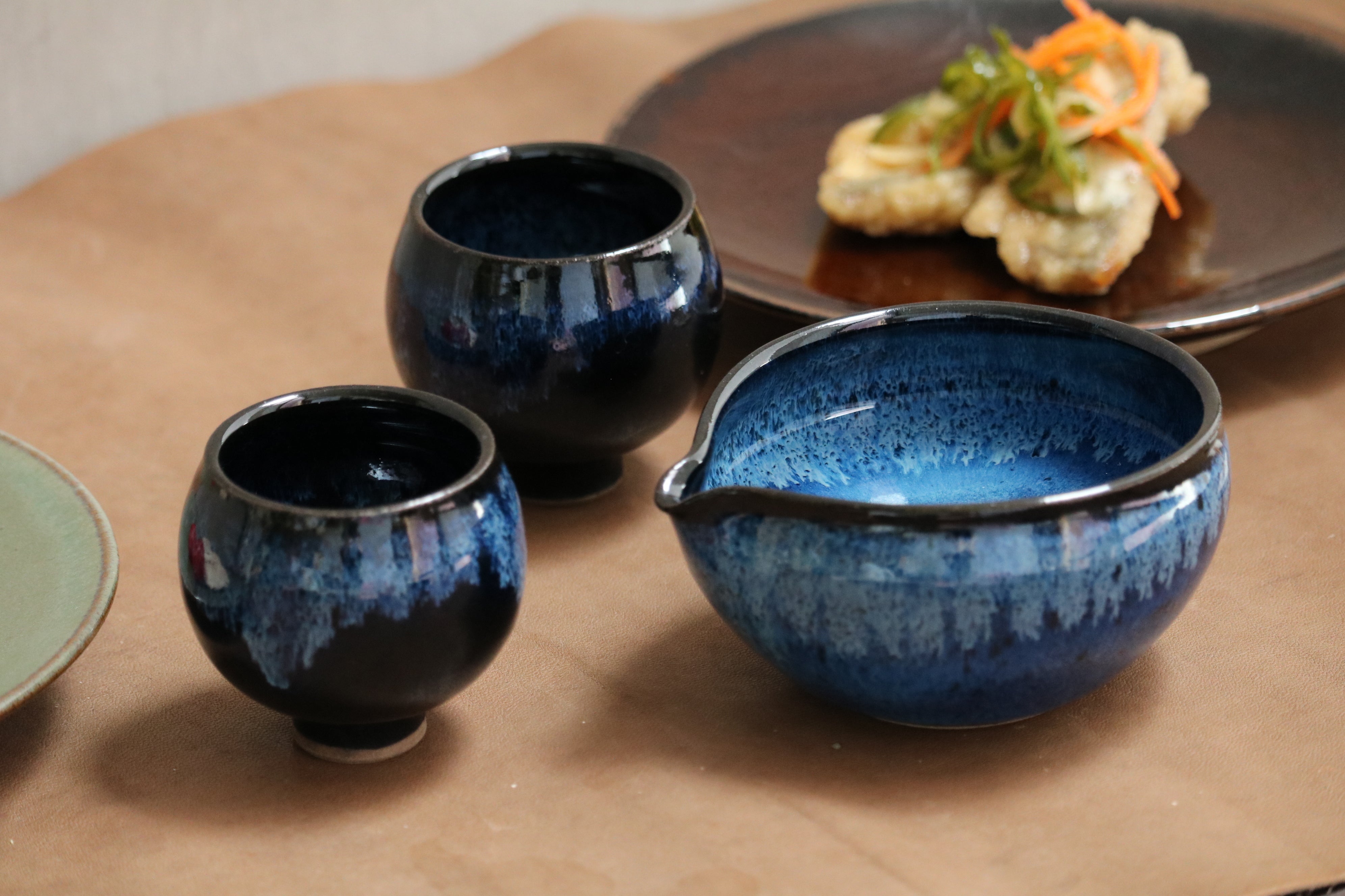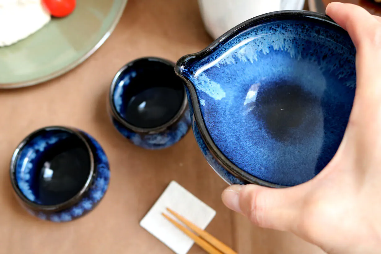 小石原焼とは、約350年に渡り、守られた伝統技術で一つ一つ手作りで作られている陶器です。標高1000m級の山々に囲まれた自然豊かな土地、福岡県朝倉郡東峰村には40を超える窯元が存在しています。その中の1つ、shuzan blueで知られる「秀山窯」に作っていただいた片口とぐい呑です。