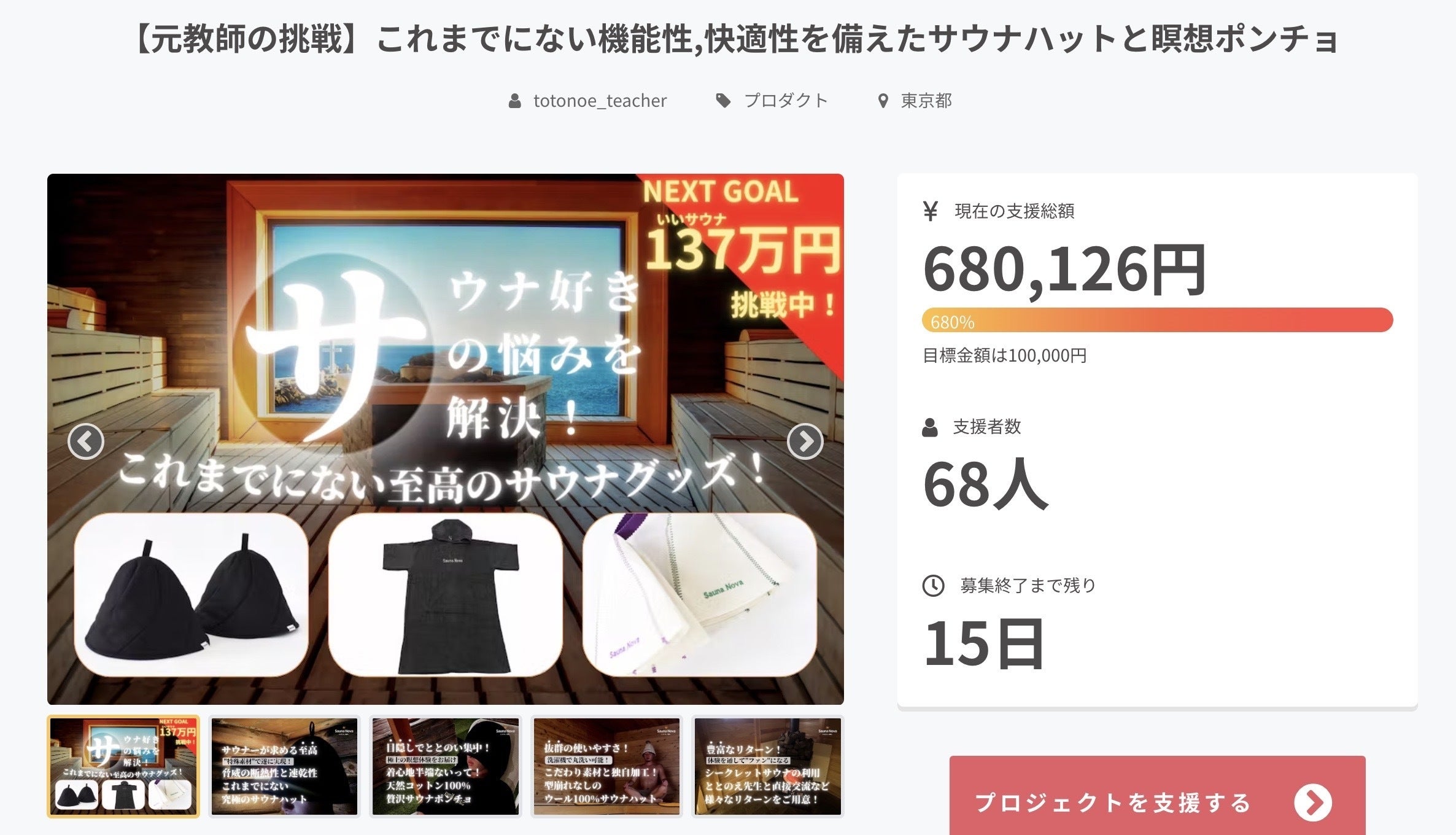 皆様、こんばんは!クラファン終了まで残り3日、ファイナルゴールの137万円までに必要な支援金額は30万円以上と、相変わらず厳しい状況です。しかし、まだ時間はあります!最後まで諦めず、全力で応援していただけるように努めてまいります!!そこで、応援プランのリターンを追加いたしました!サウナハットは持っているけど、ととのえ先生の挑戦を応援したい!サウナはあまり行かないけど、挑戦を応援したい!そんな方へ向けたリターンです。応援プラン 2,000円 (お礼のメッセージ)応援プラン 5,000円(お礼のメッセージ+ステッカー+サウナリスト)もちろん、まだまだお得な先行割引商品もご用意しております!引き続きご支援、拡散のご協力をどうぞよろしくお願いいたします!!