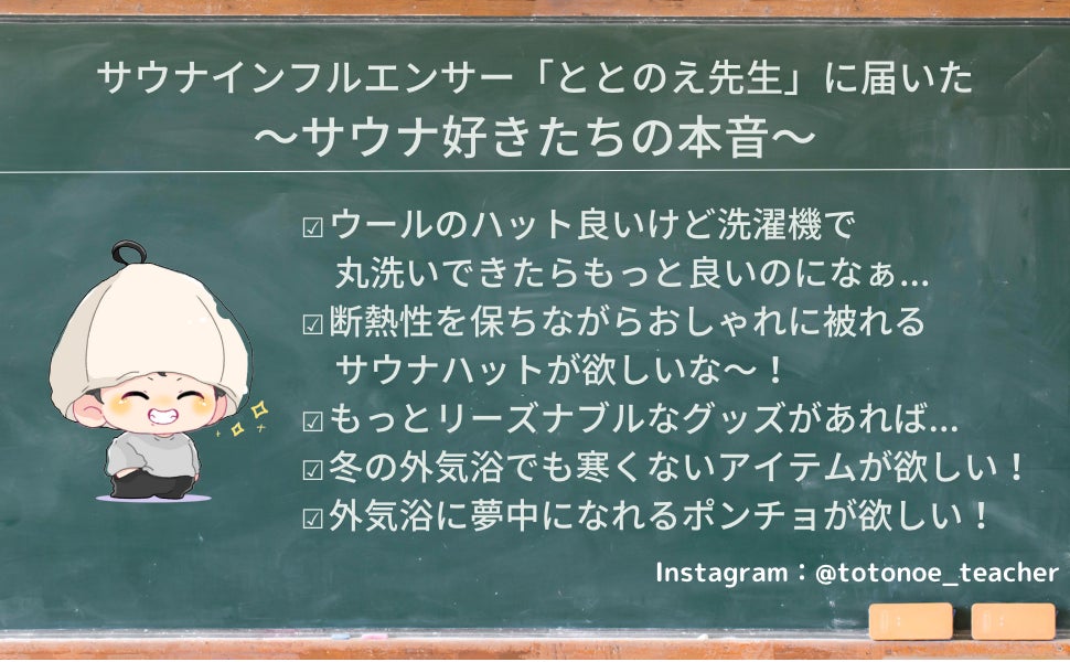 僕は全国350施設以上を訪問した経験からSNSでサウナに関する情報を発信しており、その総フォロワー数は10,000人に登ります。特にInstagramのフォロワーの方々はサウナについて詳しい方が多く、ストーリーズやDMでお話をしたり、イベントで直前交流したり、一緒にサウナへ行ったりするなど、たくさんの交流をしてきました。その中で、多くのサウナーからグッズについて以下のような意見をいただきました。