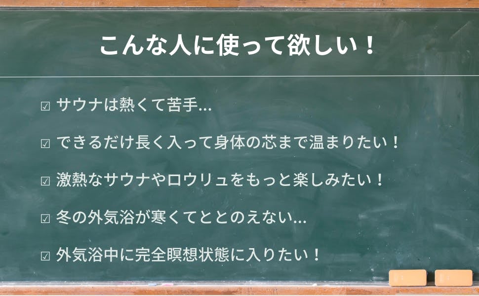 しかし、その快感を得る外気浴では、身体の表面に水分がついていると体内で温まった熱が水分に奪われてしまい、すぐに身体が冷えてしまう。また、外気浴の際に視界に余計なものが入ってしまい集中できない。
