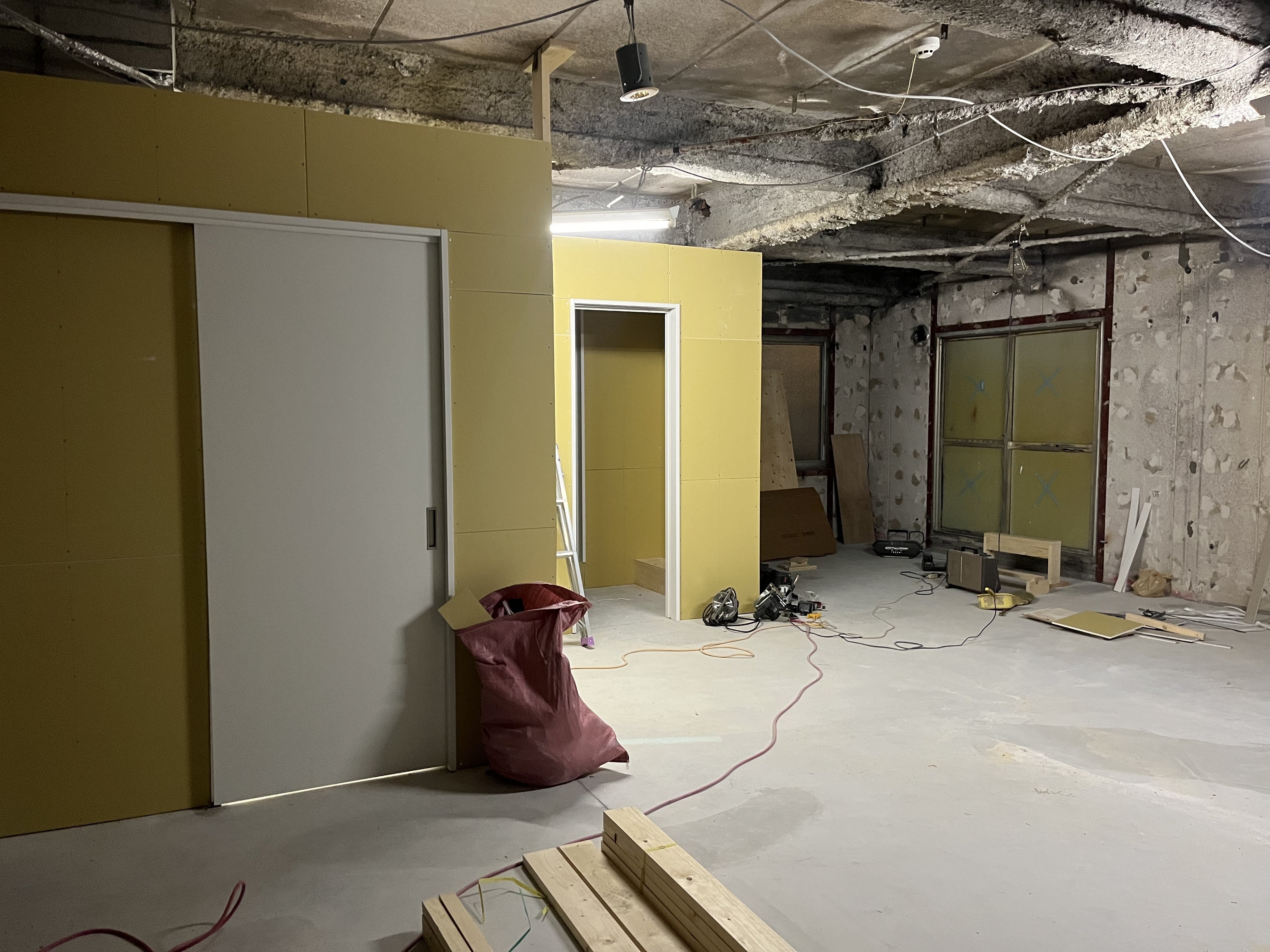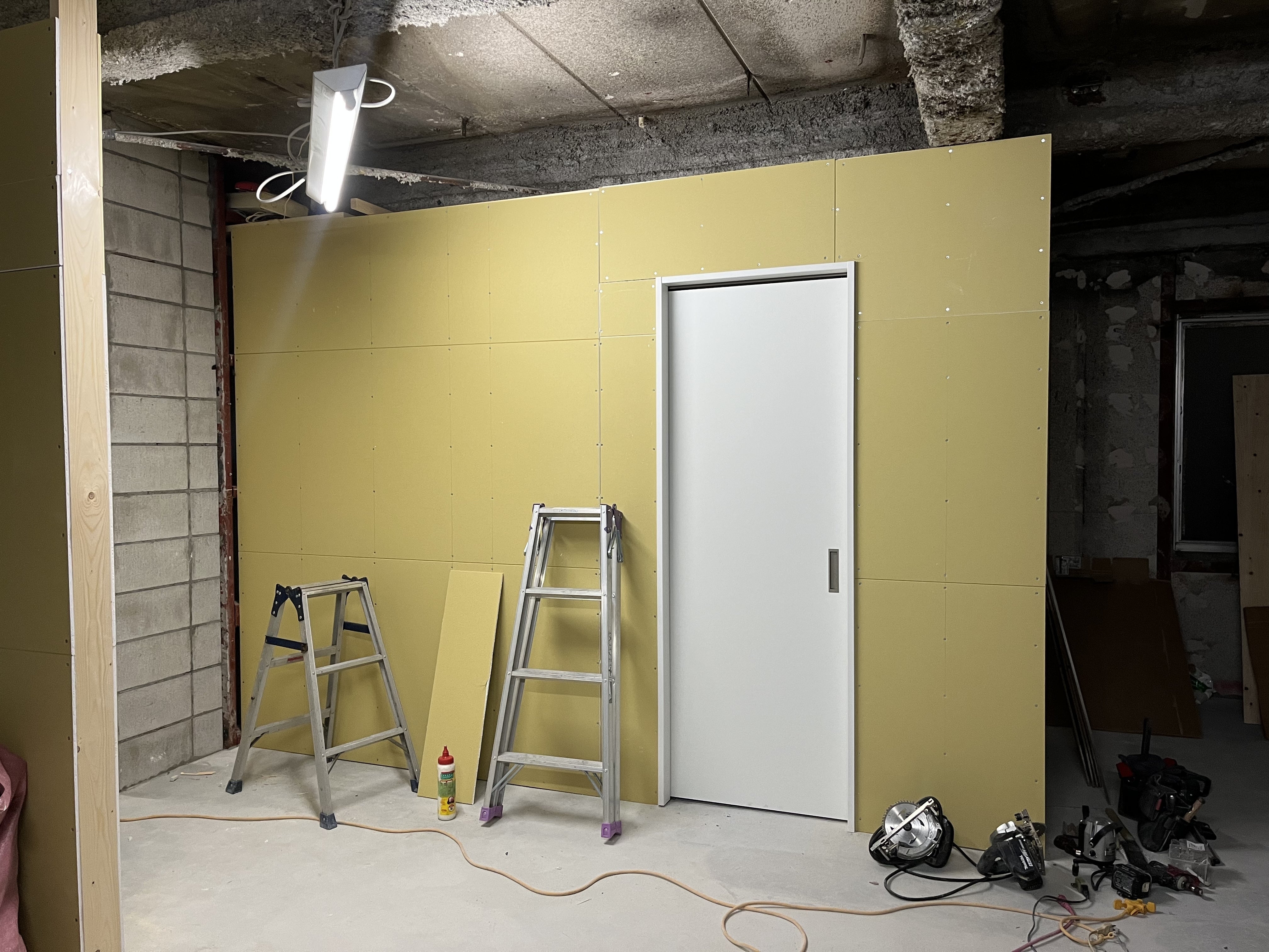 ここから更に控え室や、PAカウンター(照明、音響の操作席)などの造作を行い、工事が進んでいきます。