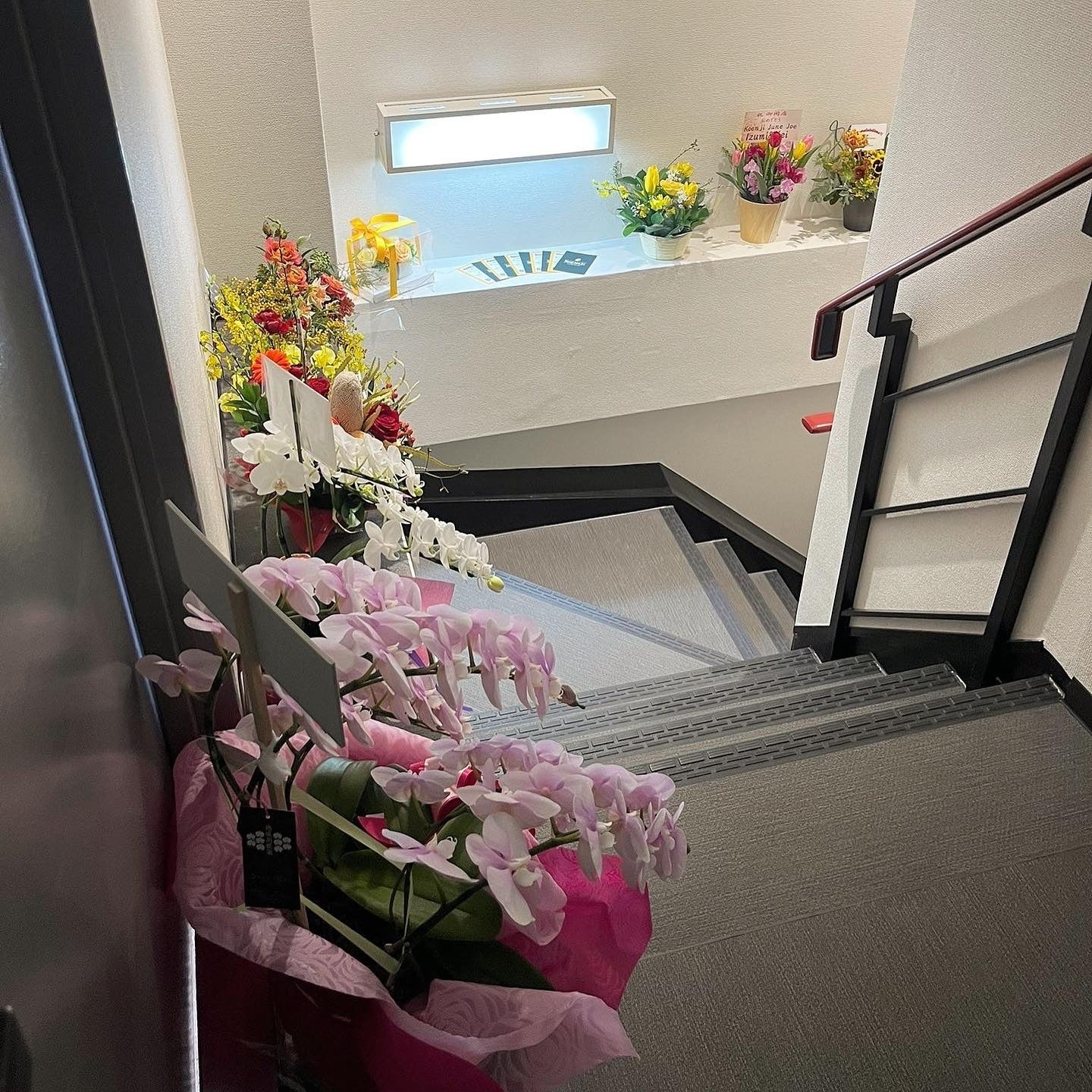 いただいたお花はジュンジョーの階段に飾らせていただいております。