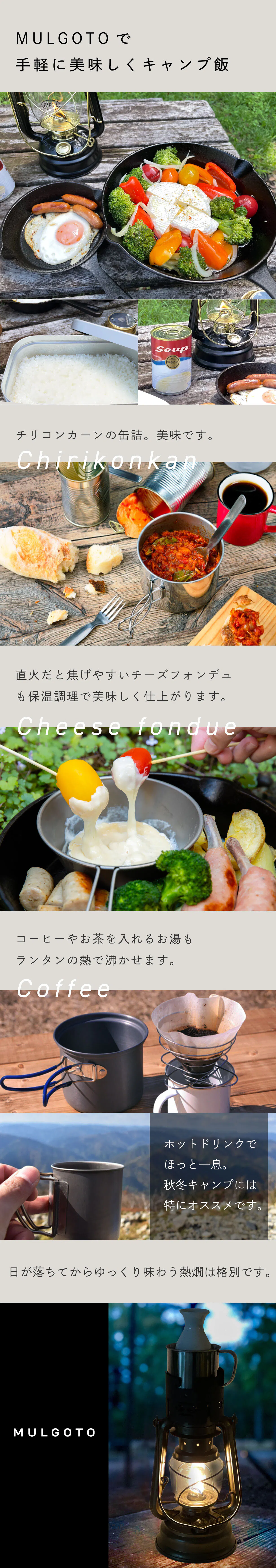 電気やガスの使えない緊急時。オイルランタンとMULGOTOがあれば、灯りを確保するだけでなく、非常食として備蓄している缶詰などを温められる他、お湯を沸かしたり、ちょっとした調理も出来て、いざという時に便利です。