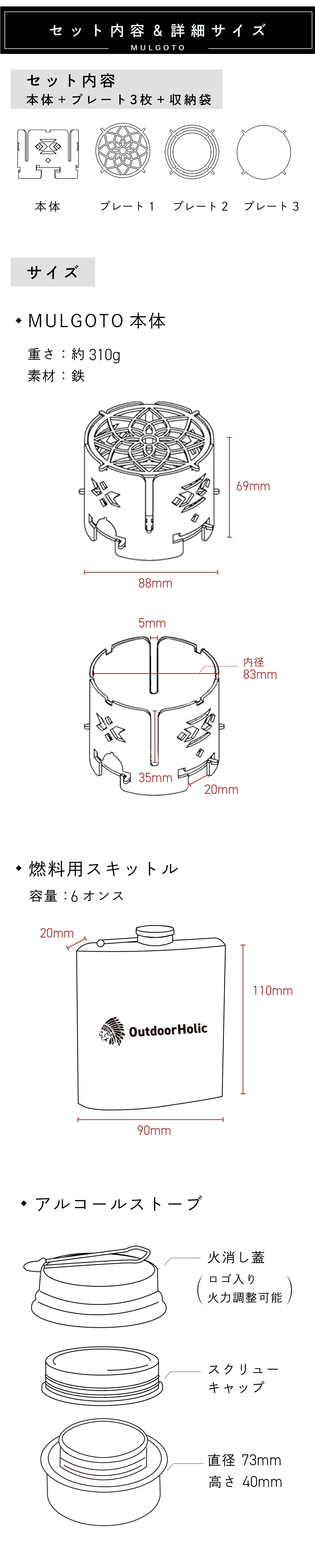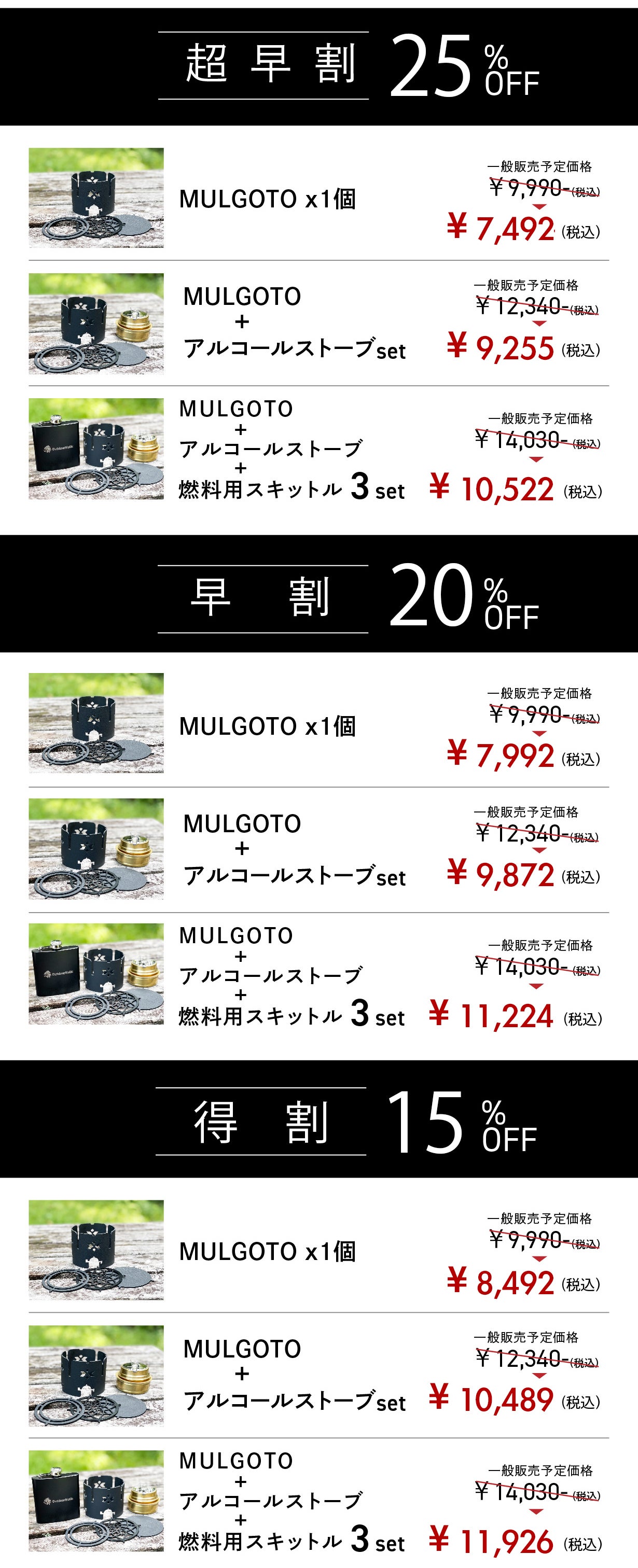 リターンにはMULGOTO単体販売のほか、一緒に使って便利なアルコールストーブのセットや燃料用スキットルをセットにしたリターンもご準備しました!