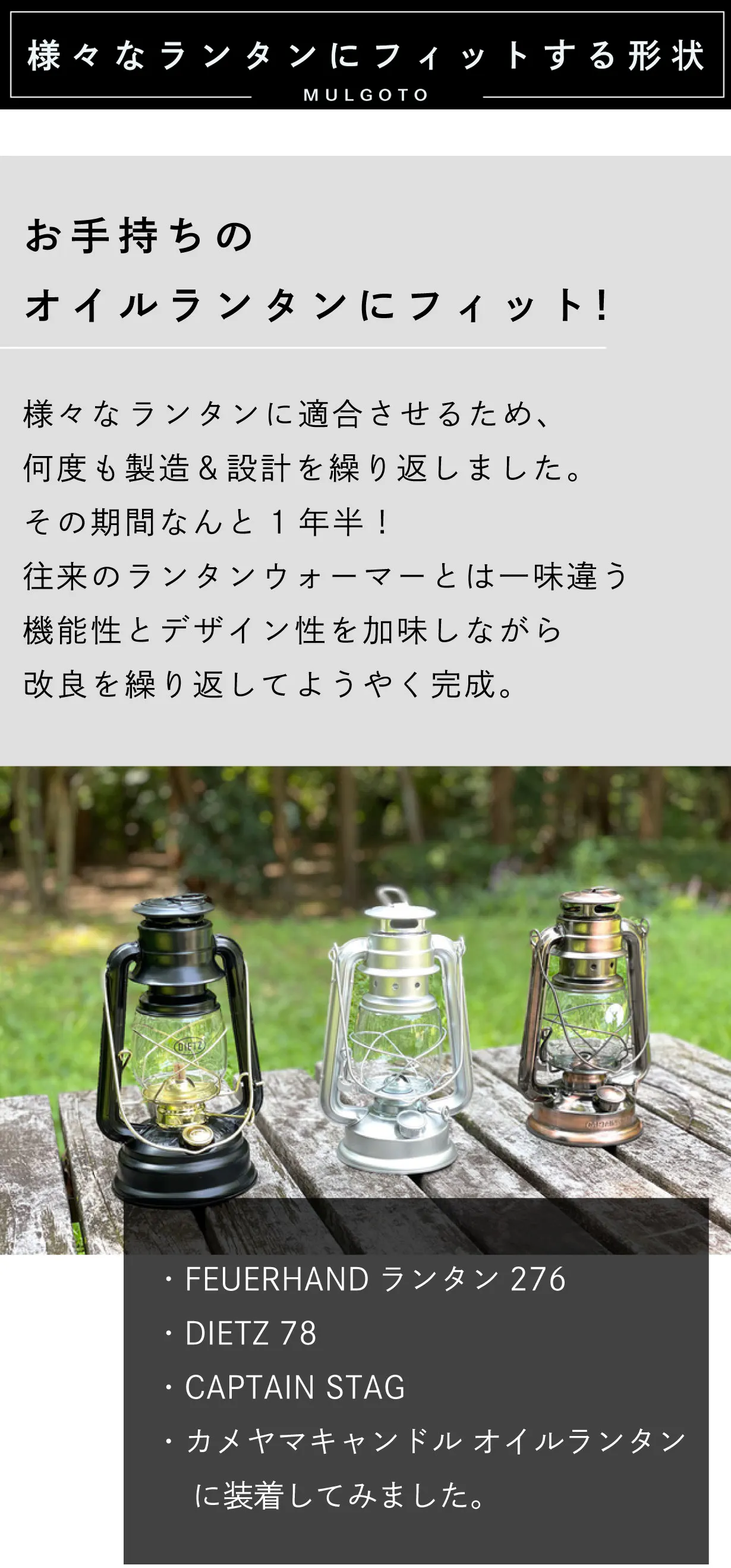 A1.弊社で設置可能を確認したランタンはFEUERHANDランタン276、DIETZ 78、CAPTAIN STAG、カメヤマキャンドル オイルランタンです。そのほかにも様々なオイルランタンに設置出来るよう考えられた特殊な設計です。