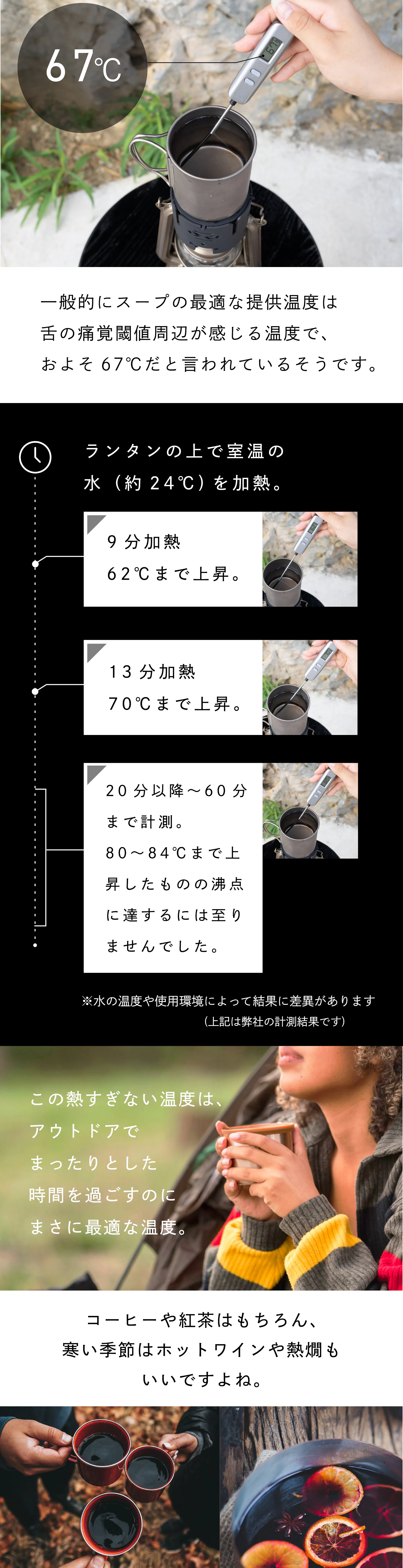 ランタンの上で室温の水(約24°C)を9分加熱したところ、62°Cまで上昇。13分の加熱で70℃、20分以降〜60分まで計測したところ80〜84℃まで上昇しましたが、沸点に達するには至りませんでした。