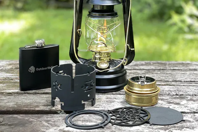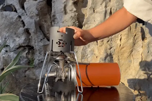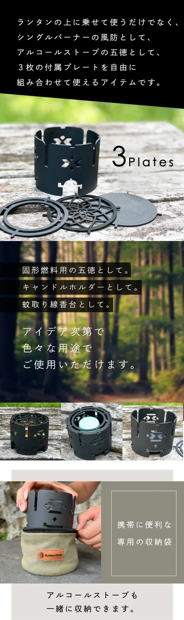セットのリターンにある「OutdoorHolic」ロゴ入りアルコールストーブは、スクリューキャップタイプで消化蓋も付属しています。消化蓋はスライドさせて火力調整ができる仕様です。