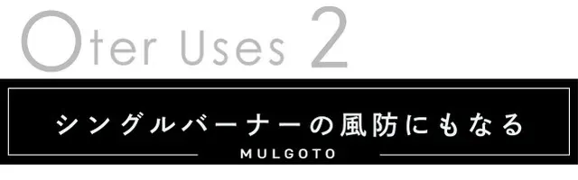 ・レギュレーターストーブの風防としてご使用の場合、設置の際はMULGOTO本体がガス缶に触れていないことを必ず確認して下さい。MULGOTOがガス缶が触れているとMULGOTOからガス缶に熱が伝わり、ガス缶が破裂する可能性があり大変危険です。