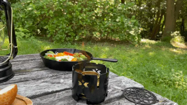 風に料理を邪魔されるアウトドアでのあるある。MULGOTOをシングルバーナーにかぶせるだけでウインドシールドとして使えます。