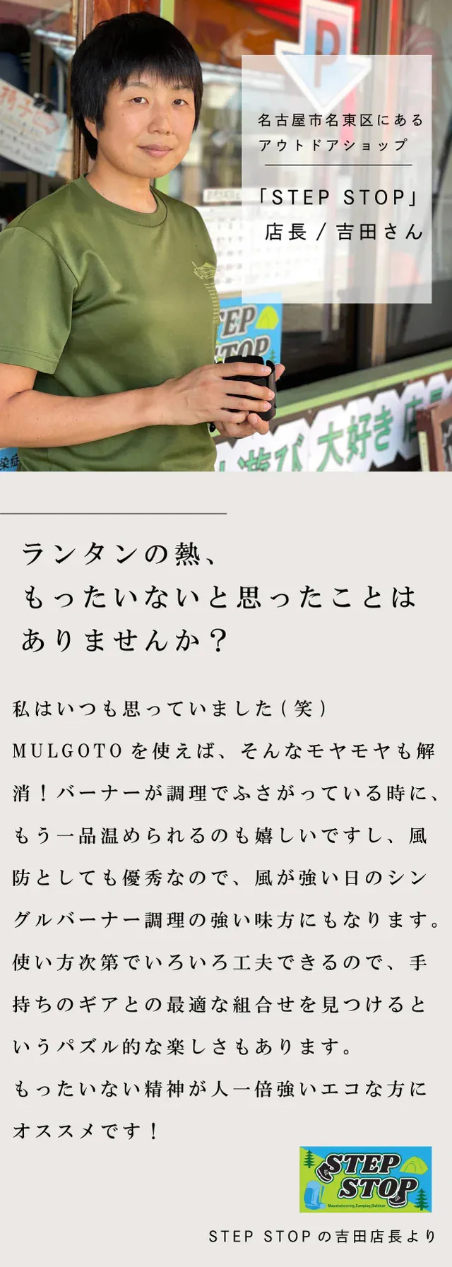 名古屋市名東区にあるアウトドアショップ「STEP STOP」の店長、吉田さんにMULGOTOを使ってもらい、感想をいただきました。吉田店長はアウトドア歴10年以上のベテランです!