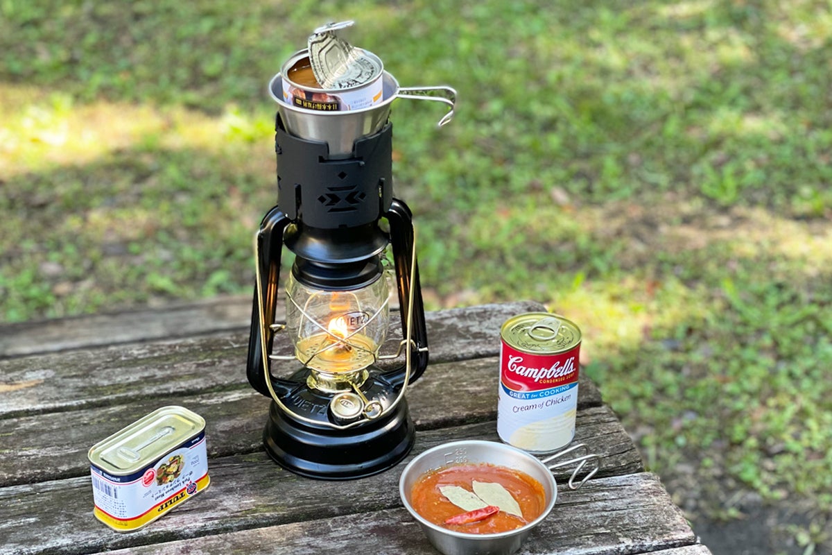 キャンプ飯やおつまみに人気の缶詰3種をシェラカップに移してランタンの上で温めてみました。