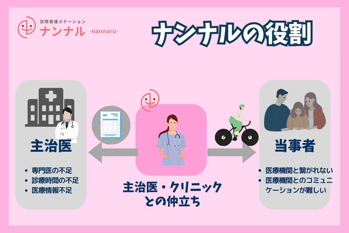 ナンナルは訪問看護という医療制度により、ステーションから利用者のご自宅にスタッフを派遣します。