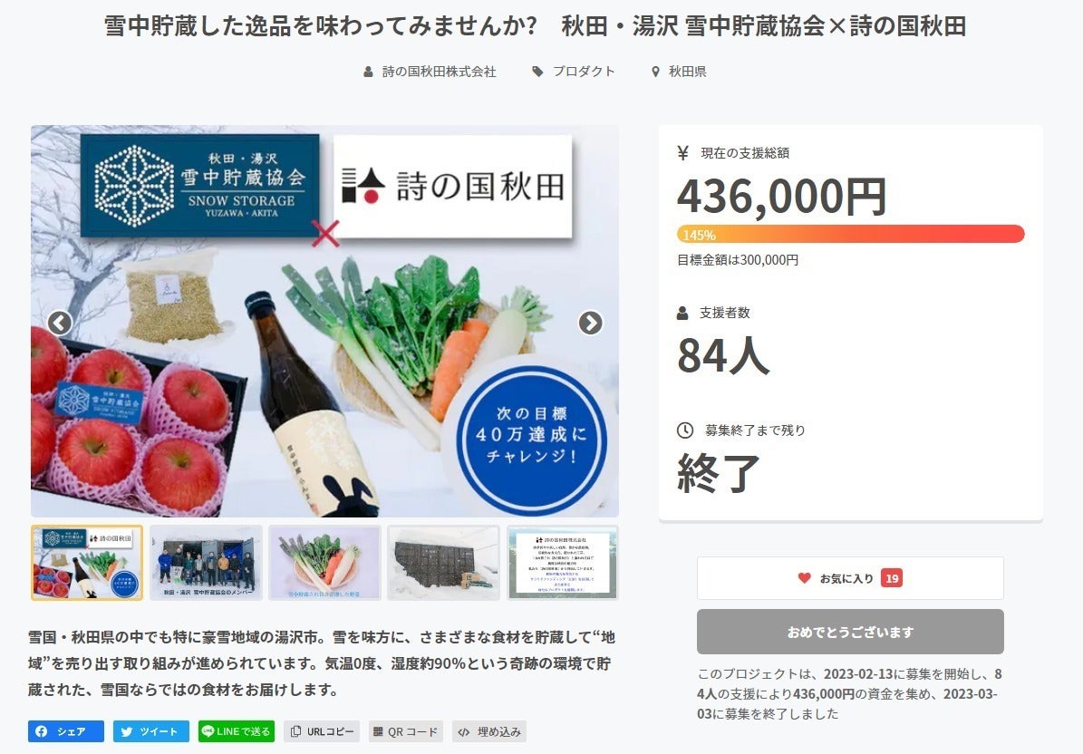 2023/03/04 09:58昨日をもって無事、プロジェクトが終了しました!最終的に、支援総額436,000円、支援者数84人という大きな支援をいただきました。ご支援してくださったみなさま、本当に本当にありがとうございました!!雪中貯蔵した品々をこれから順次みなさまの元へお届けしますのでお楽しみに!これからも「秋田・湯沢 雪中貯蔵協会」さんをよろしくお願いします!そして、「詩の国秋田」では秋田の魅力溢れる生産者や商品を紹介するプロジェクト第二弾を計画中です。こちらもぜひお楽しみに!! もっと見る