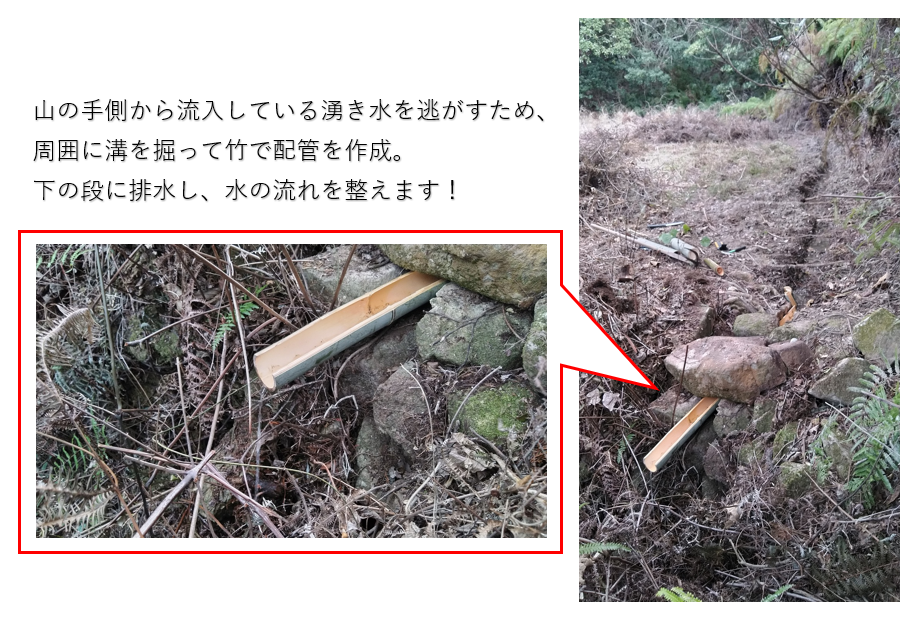 水がうまく流れずに土を伝って広がっていく悪循環を整える作業です!