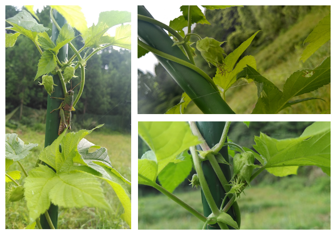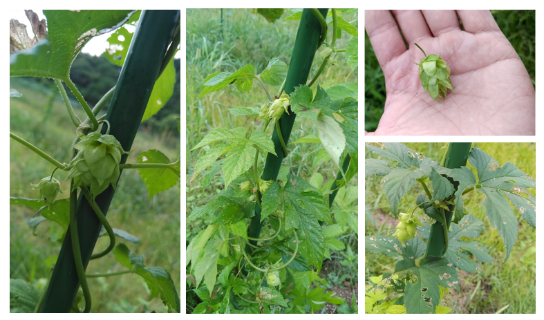 実ったホップ(毬花)も大きく育ってきました!植えた苗100株のうちのまだまだ数本ですが、しっかりと育ってくれています。ただ、課題は多い。畑全体を見るとまだまだ成長していない苗の方が多く、小さいままでなかなか大きくならない苗横に広がるものの上に向かって絡みつかない苗集中的に虫(特に芋虫)に喰われる苗様々な状態が顕著になってきました。昨年までとは異なる条件の土地柄や、土壌の生育の未熟さを考慮すればよく育ってくれている方だとは思いますが…。少しでも多く収穫できるよう、来年以降に引き継いでいけるよう、しっかりと対策を考えていきます!!