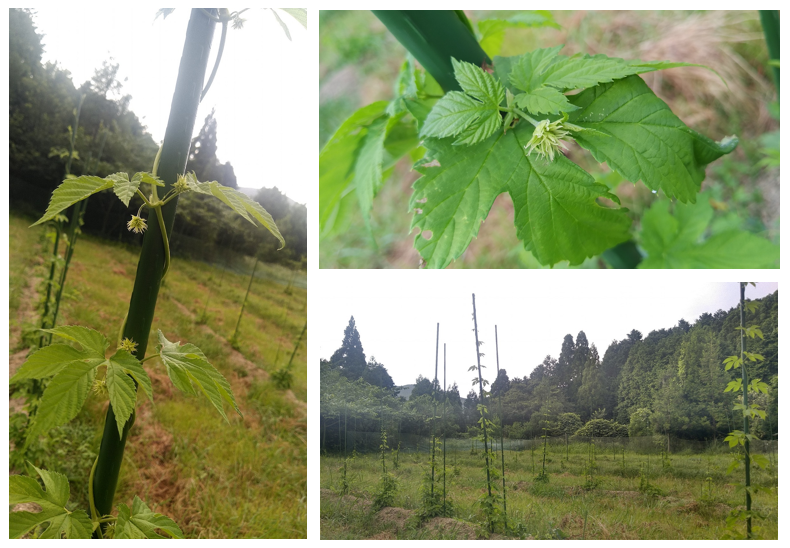 数日前にはついていなかったホップ(毬花)の子供(子供?)梅雨明けからの日照りで一気に成長してきたホップたち。蔓下げをしながら伸ばしている苗のいくつかにホップの前兆が見られています!脇芽ではないこの小さな塊が毬花(まりはな・キュウカ)となり、ビールの苦味・泡・香りのもとになっていきます。土壌改良を行った畝を中心に畑手前側の成長が著しく、畑の奥側がイマイチの成長速度。ph値の偏りが成長に影響しているのでしょうか?陽当たり具合なのでしょうか?まだまだ手探りの五島ホップチャレンジも、毬花の前兆が見られたことで一歩、前進できたのかなと思います。今後の成長にもご注目ください!!