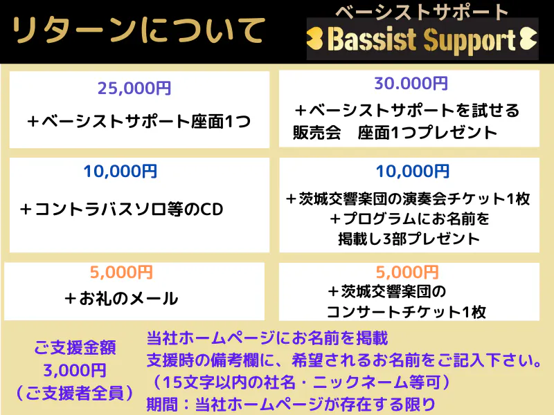 皆さんの知恵を集め、コントラバス演奏用の椅子を開発して「ベーシストサポート」を世に出し、コントラバスを演奏を楽しめる人を増やしたい!そのためにご支援を頂きたいのです!